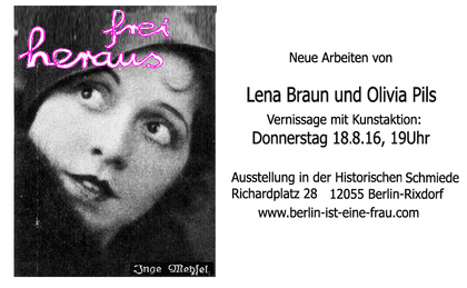 Die Künstlerinnen eröffnen die Ausstellung mit einer Kunstaktion, in der sie ein Denkmal enthüllen mit der sie an eine berühmte Rixdorferin erinnert: Die Schauspielerin und Kämpferin Inge Meysel, die im Mai 1919 unweit der Schmiede geboren wurde.